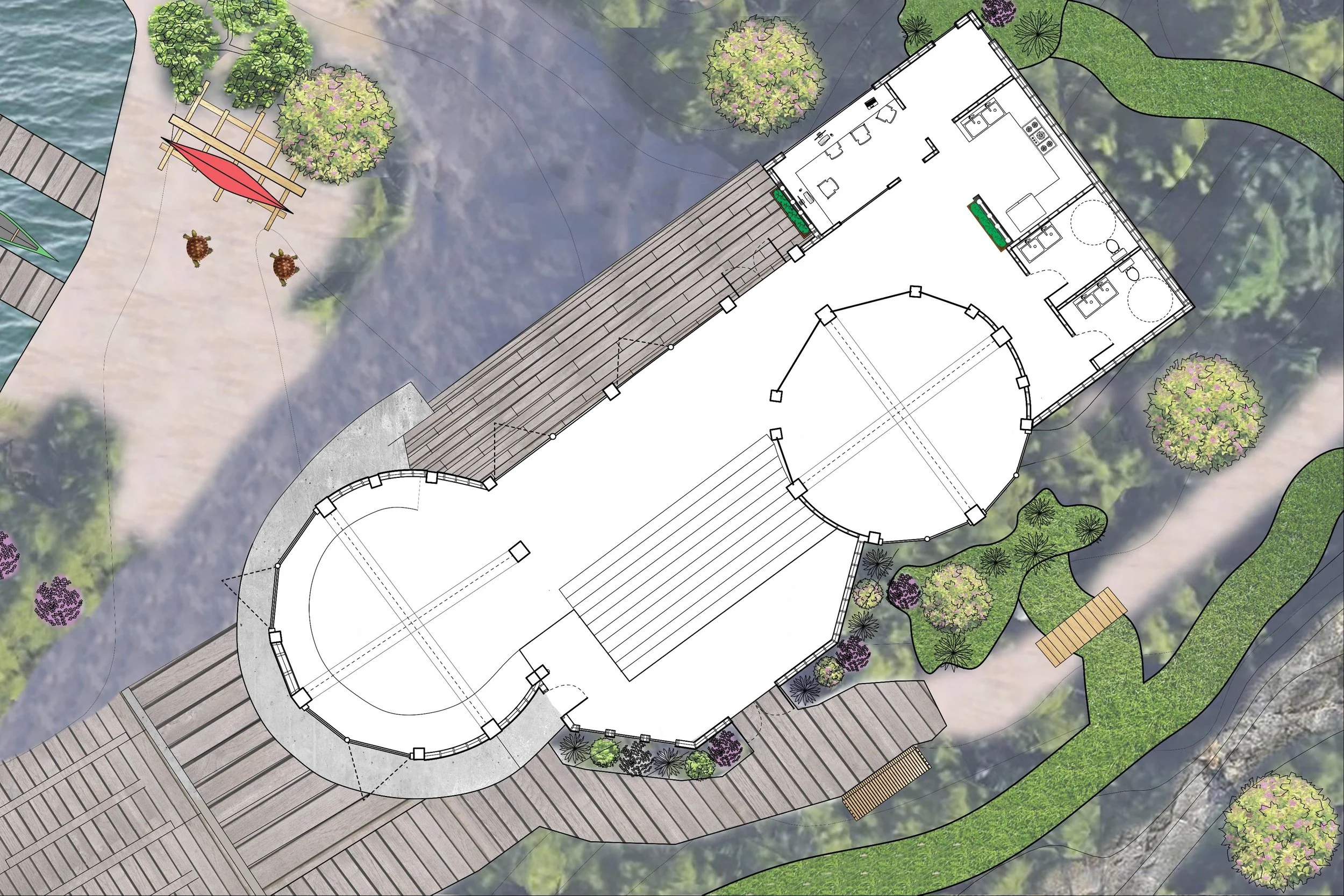 In Native American culture, the turtle is symbolic of mother earth and nature. Creation stories for many North American native groups depict the continent itself as a giant turtle island with a terraformed shell. This idea of a giant turtle with entire ecosystems growing from it’s back is what inspired this project. Through the various connections to the site; Native American origin stories, and the protected turtle hatchery on the property, the ecology center uses a family of turtles as its central motif.