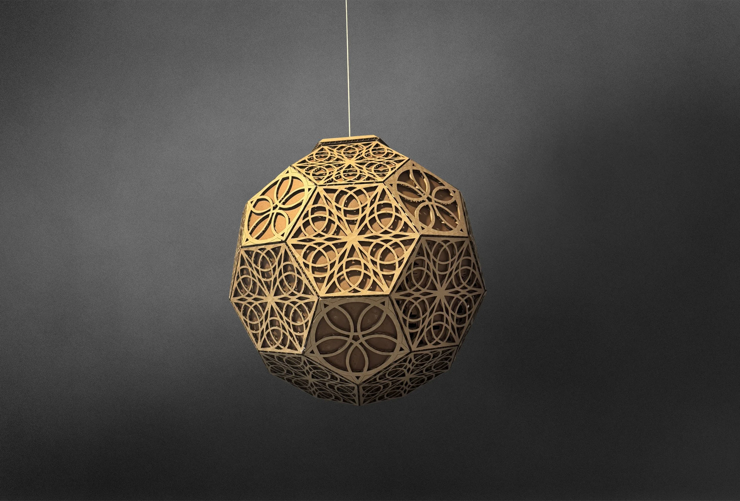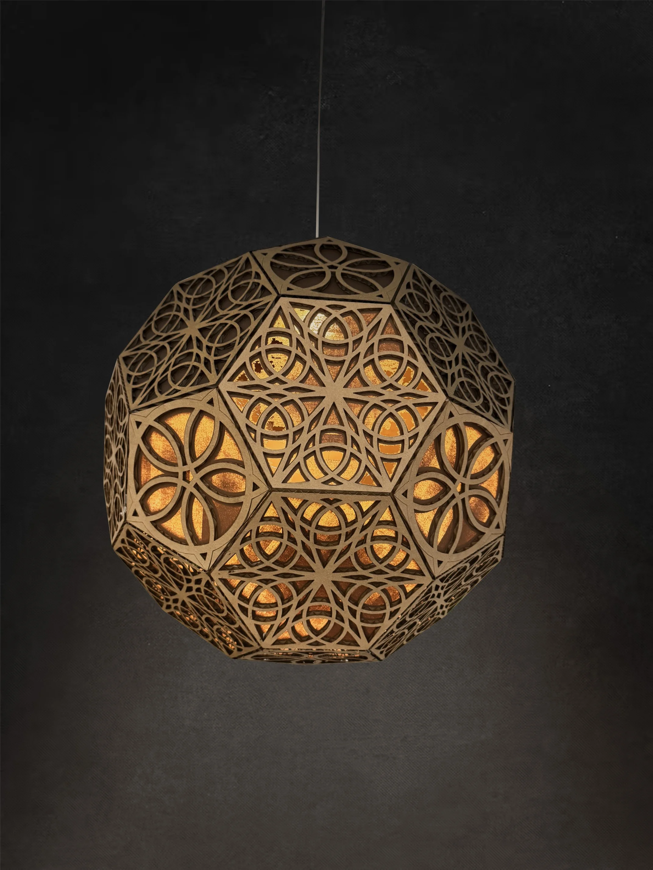 Rather than being applied as surface decoration, the Triquetra becomes the structural and functional foundation of the piece. Repeated and interwoven, the symbol forms a unified geometric pattern that shapes the light itself.